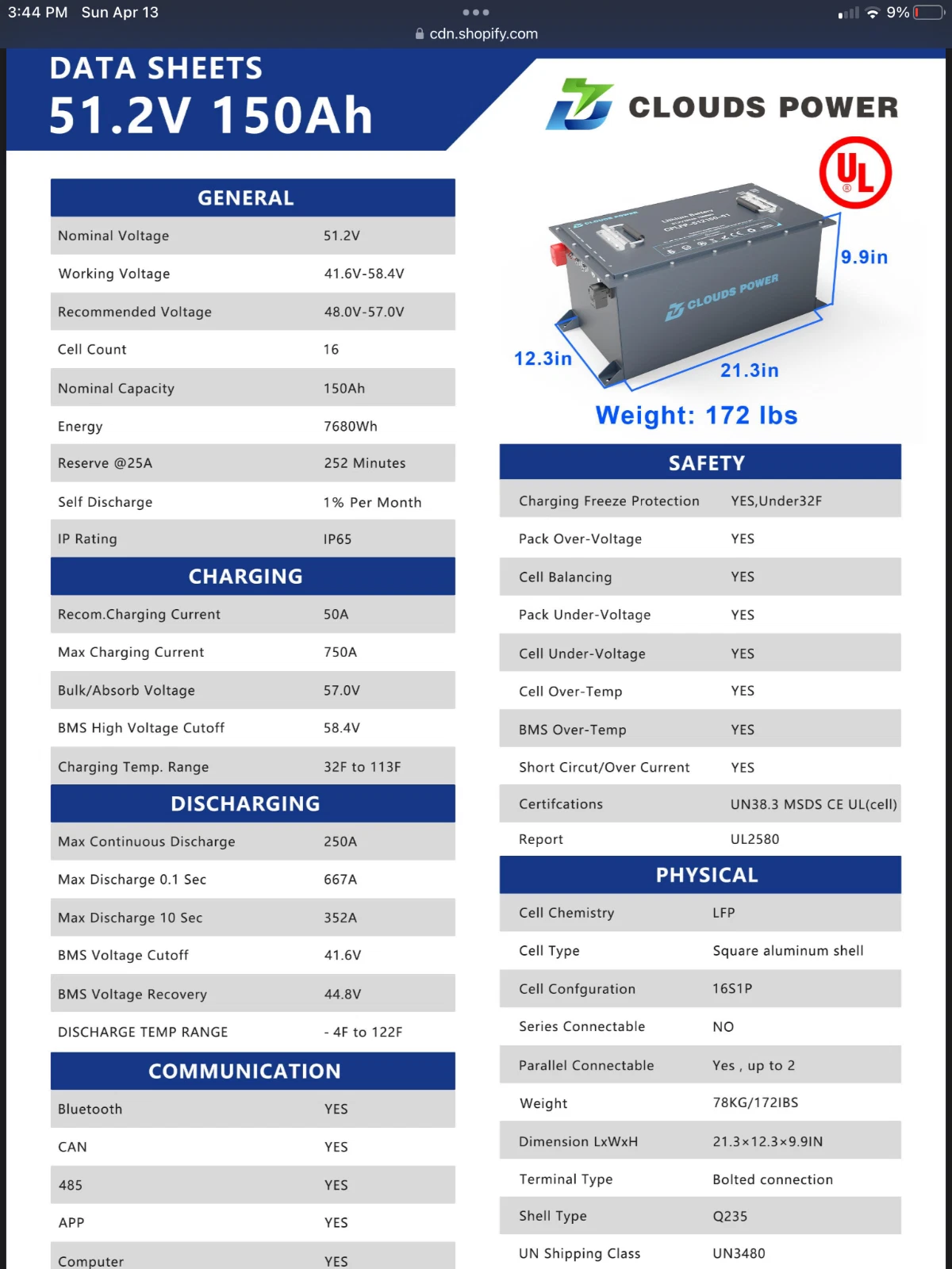 A fully charged 48V 150AH Clouds Power battery can travel up to 70 miles on a charge, and weighs 172 pounds. As our largest option, this battery is heavier than its lower AH options, but its increased power output allows it to travel much further.